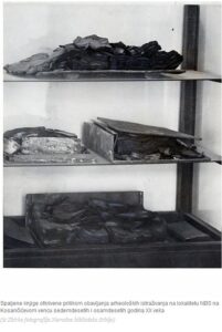 Spaljene knjige otkrivene prilikom obavljanja arheoloških istraživanja na lokalitetu NBS na Kosančićevom vencu sedemdesetih i osamdesetih godina XX veka